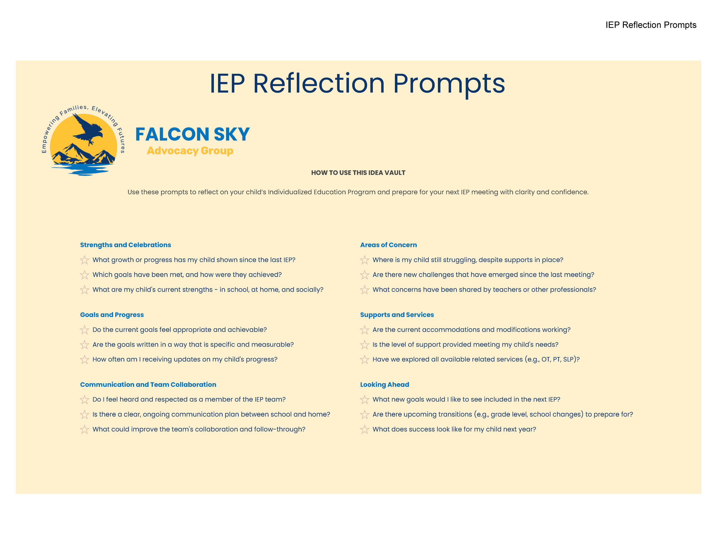 The IEP Reflection Prompts are designed to help parents organize thoughts that often stay swirling in their heads.